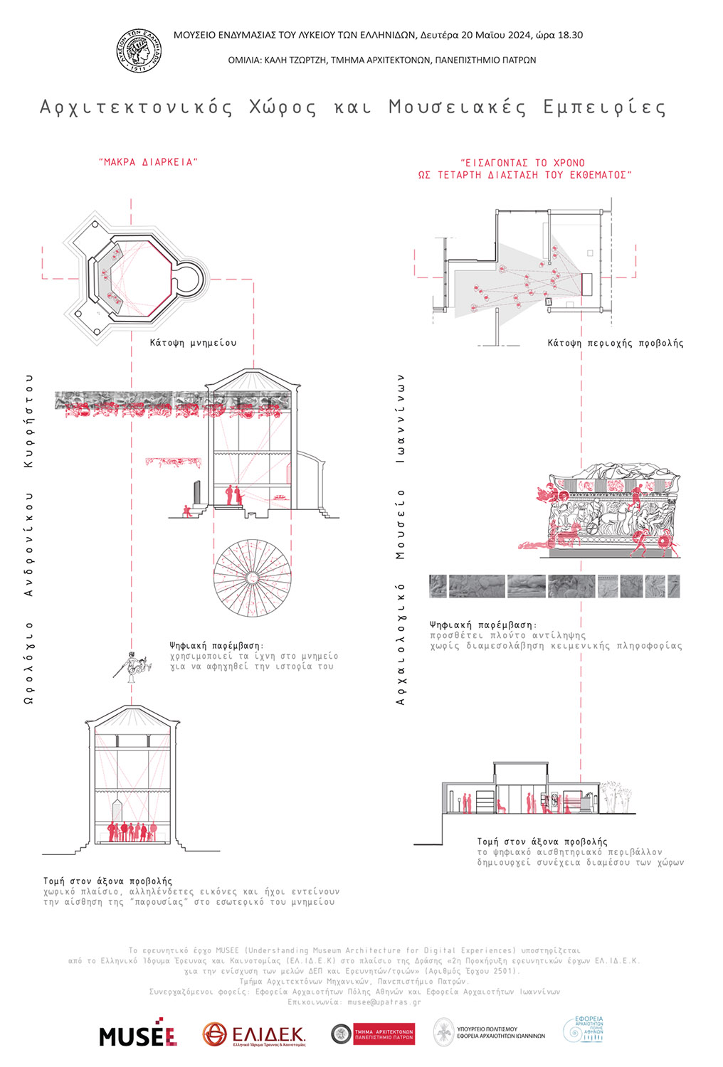 Το ερευνητικό έργο «MUSEE | Understanding Museum Architecture for Digital Experiences» υποστηρίχτηκε από το Ελληνικό Ίδρυμα Έρευνας και Καινοτομίας (ΕΛ.ΙΔ.Ε.Κ.) στο πλαίσιο της Δράσης «2η Προκήρυξη ερευνητικών έργων ΕΛ.ΙΔ.Ε.Κ. για την ενίσχυση των μελών ΔΕΠ και Ερευνητών/τριών» (Αριθμός Έργου: 2501). Δικαιούχος/Φορέας υποδοχής: Πανεπιστήμιο Πατρών, Επιστημονικά Υπεύθυνη: Καλή Τζώρτζη 2022-2025
